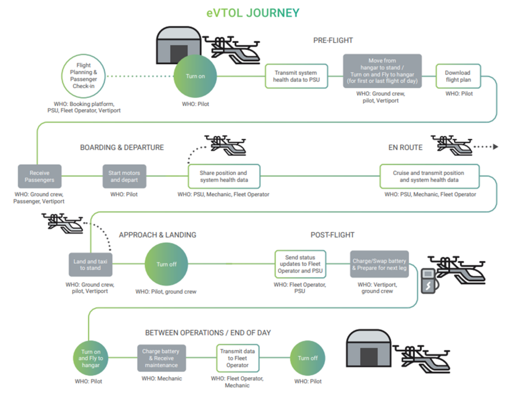 The OMF hosted several public working group meetings and discussions with industry and civic leaders, including Eve Air Mobility and cities including Los Angeles, Orlando, San Francisco, and Chicago to explore how MDS and data could ensure safe and successful AAM deployment. The discussions focused on shared passenger (i.e. air taxis) and cargo flights (as opposed to drones or personally-owned eVTOLs) and flights that include new vertiports or repurposed heliports within urban areas, as these require city planning and land-use consideration and approval. Together, we walked through representative eVTOL and passenger journeys to discuss the types of information that needs to be exchanged between public agencies, vertiport operators and eVTOL fleet operators at different stages of the journeys.