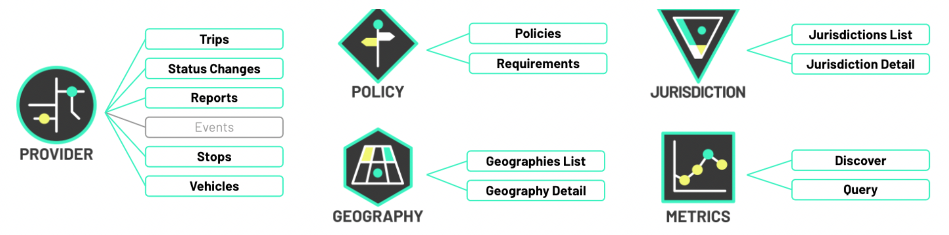 MDS has been designed from the beginning to be a modular kit-of-parts. Regulatory agencies can use the components of the API that are appropriate for their needs. How cities use MDS depends on a variety of factors: their transportation goals, existing services and infrastructure, use cases, and the unique needs of their communities. Most agencies will not use all parts of MDS, and instead can use Requirements to clearly choose only what they need. The full suite of available APIs and endpoints can be seen here.