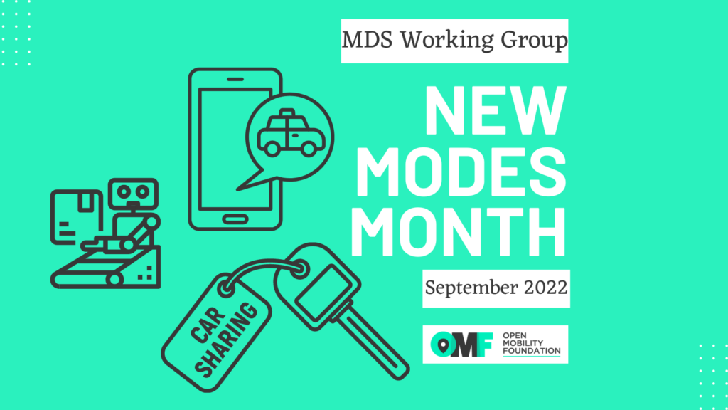 This September, the Open Mobility Foundation’s MDS Working Group will be focused on the addition of new modes. We are calling this sprint of work “Modes Month”. The next four working group meetings will focus on different aspects of new modes –passenger services, delivery robots, and carshare.