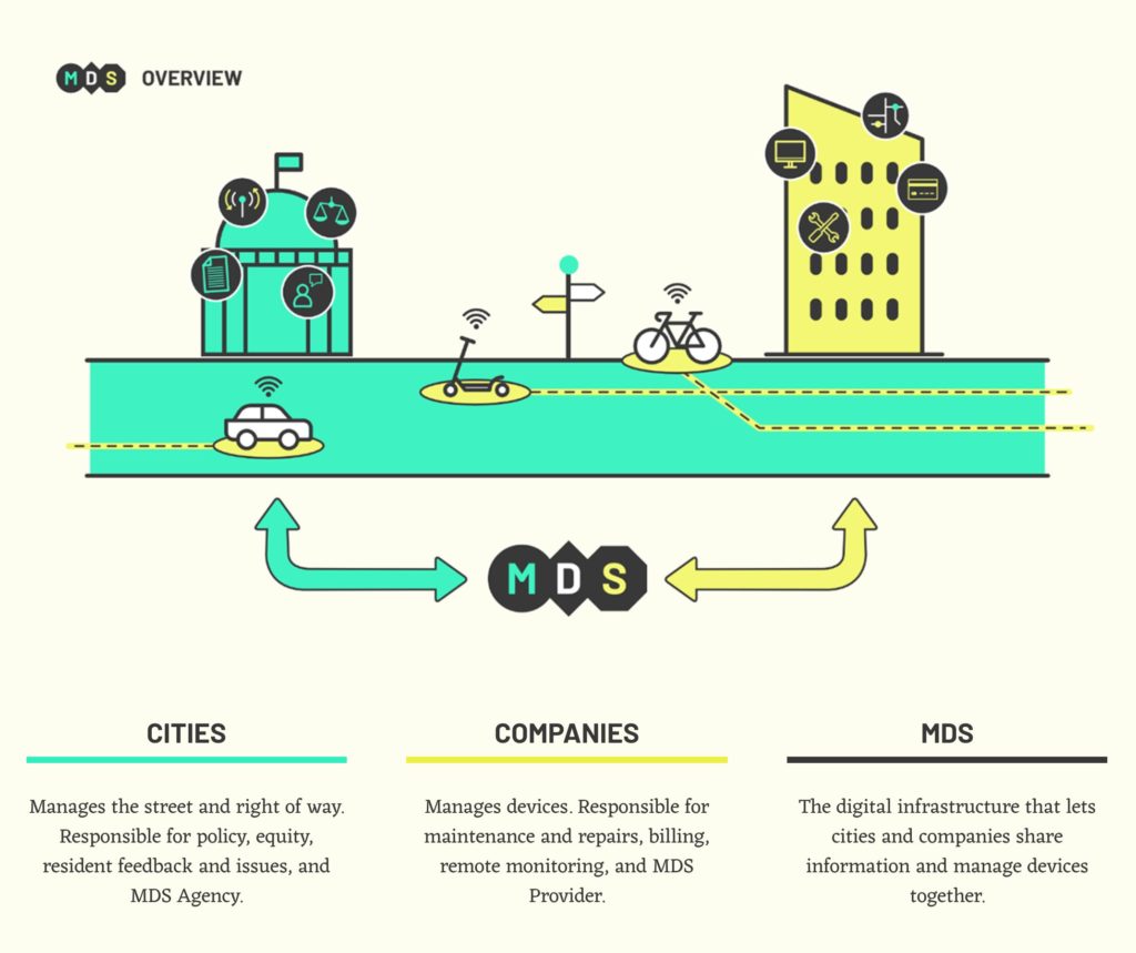 While the goals of government are clear, the tools we’ve been using for the past 100 years aren’t well-adapted to today’s technology-driven mobility landscape. Core to the future of mobility is the development of a set of digital tools for public entities – like city departments of transportation or metropolitan planning organizations – to manage the public right of way. The Mobility Data Specification (MDS) meets this need by serving as a widely-adopted, standardized means of digital communication between the public entities that manage our streets and sidewalks and the organizations that use them to provide transportation services.